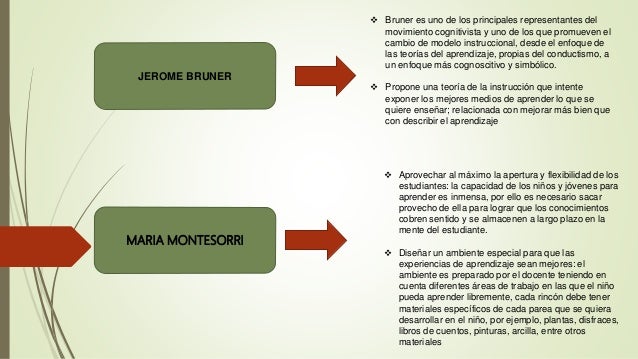 Bruner es uno de los principales representantes del movimiento cognitivista y uno de los que promueven el cambio de modelo instruccional, desde el enfoque de las teorías del aprendizaje, propias del conductismo, a un enfoque más cognoscitivo y simbólico.